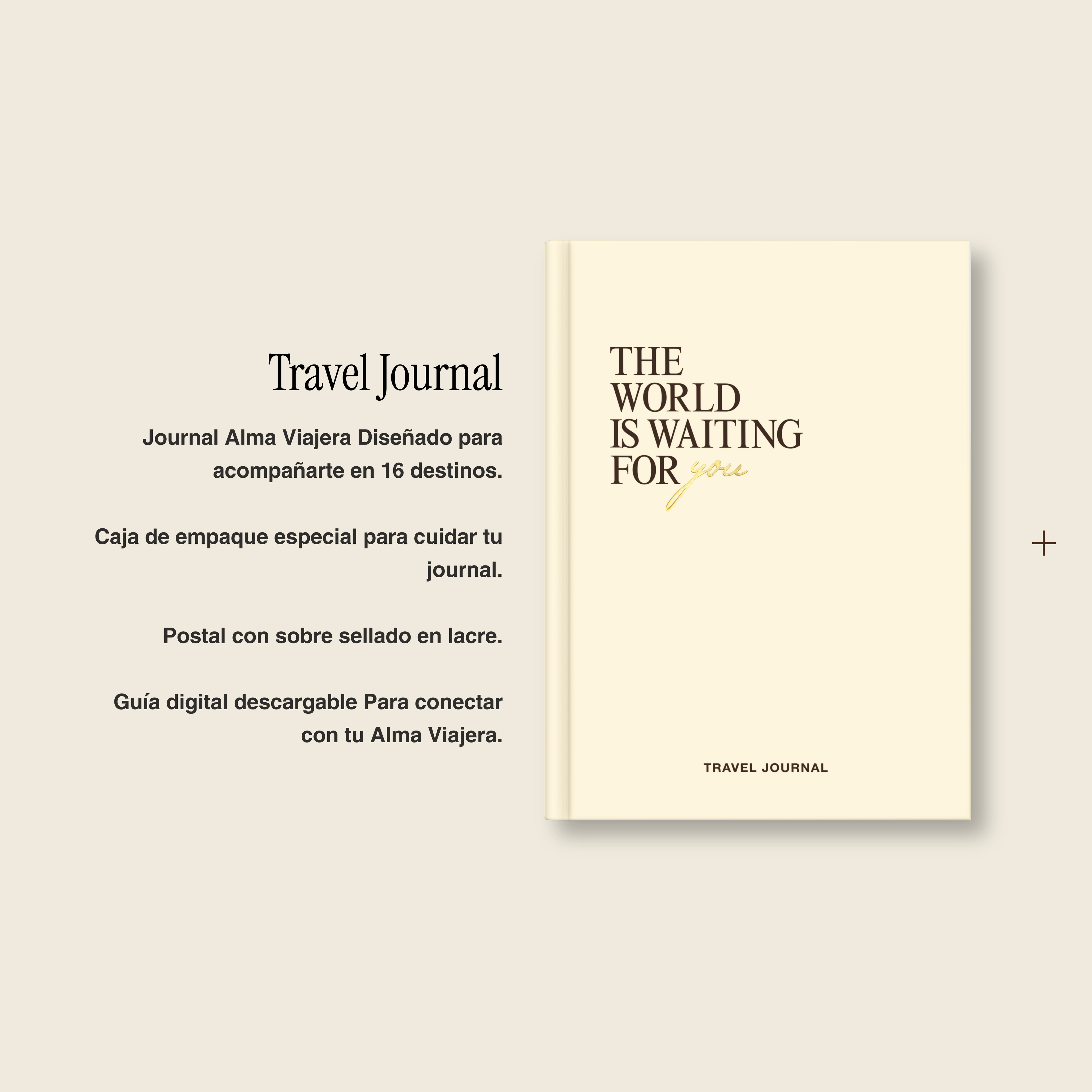 El Journal Alma Viajera con capacidad para 16 destinos + el Planner Digital de Viajes en Notion. Además, recibirás el journal en su caja de lanzamiento, con postal y sobre sellado en lacre, y acceso inmediato al planner digital.