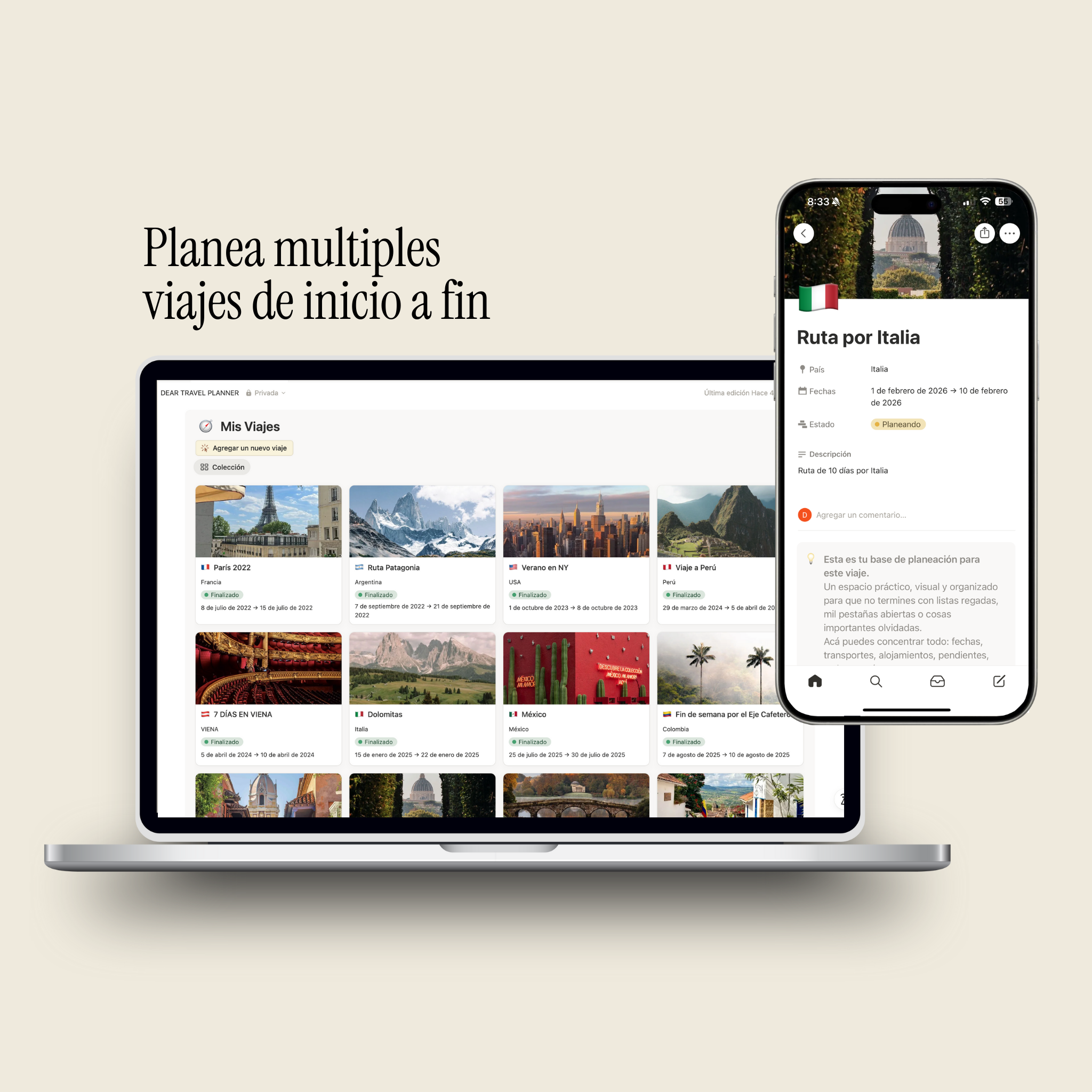 Podrás abrirlo en tu computador, tablet o celular, editarlo y personalizarlo como quieras. Está diseñado para que puedas planificar desde la primera idea hasta el último día del viaje en un mismo flujo, sin perder información.