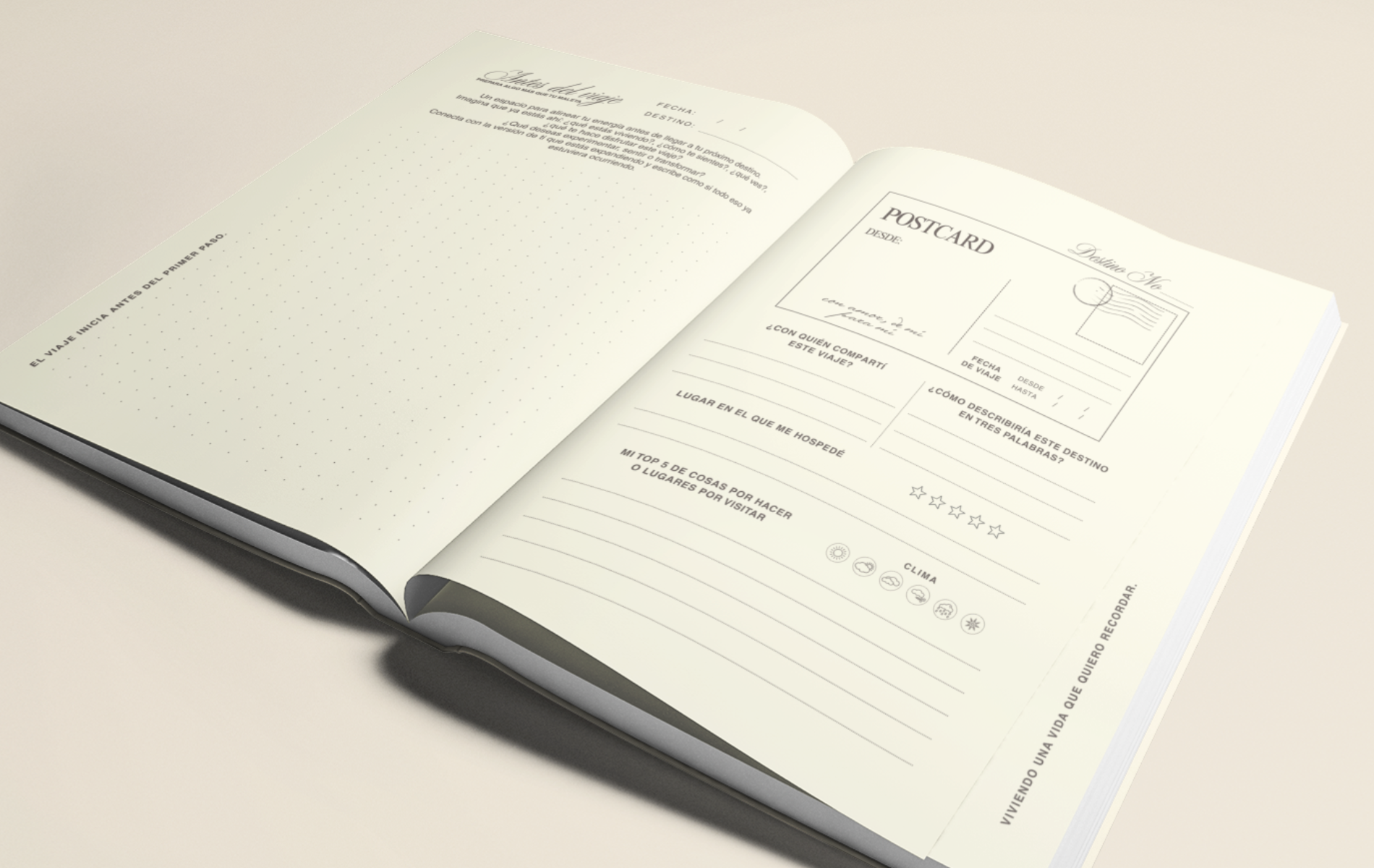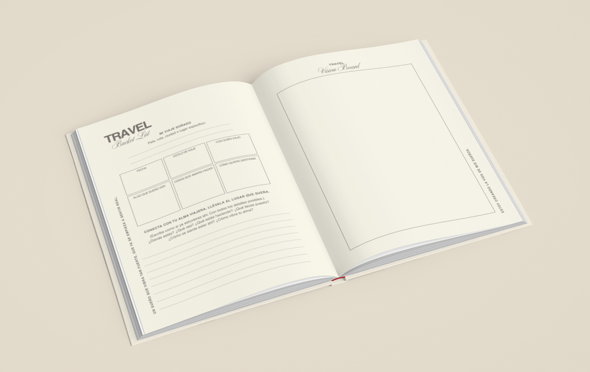 Diseñado para acompañarte en 16 destinos, con páginas con preguntas guiadas, ejercicios de escritura y páginas libres para escribir, crear o guardar tus recuerdos.